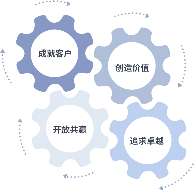 成就客户是一切决策的出发点,,,创造价值是衡量所有工作的标准,,,,追求卓越是我们做事做人的态度,,,开放共赢是我们的格局也是最终的结果。。。。价值观的齿轮环环相扣,,,推动着组织里的每个人不断向前。。。。