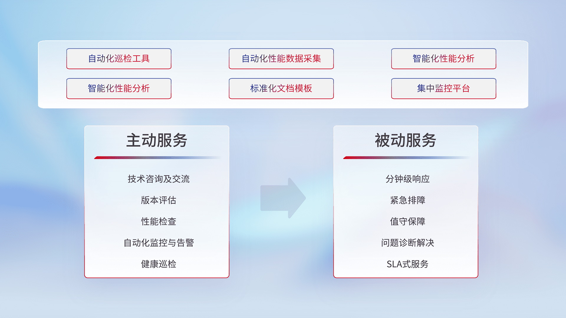 智能化工具和标准化文档,,,,保障服务质量,,提供主动服务(包含技术咨询、、版本评估、、、、性能检查、、、、自动化监控与告警、、、、健康巡检)和被动服务包含(分钟级响应、、紧急排障、、、、值守保障、、、问题诊断解决、、、、SLA服务)。。。